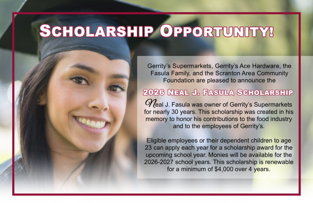 - You are the dependent child of a Gerrity’s Supermarket or Gerrity’s Ace Hardware employee, and your parent has worked with Gerrity’s for 3 years as of January 1, 2026. Parent employees must have worked a minimum of 1250 hours (24 per week per year).