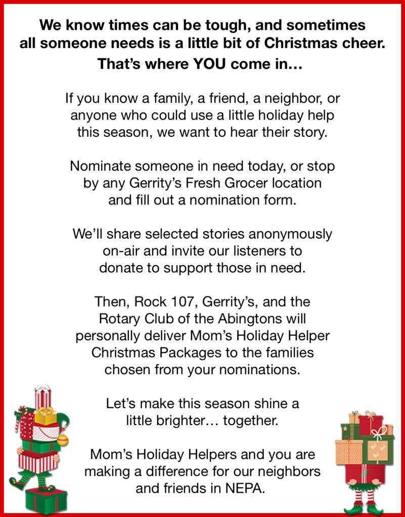 This holiday season, Rock 107 and Gerrity’s Fresh Grocer are teaming up once again… for Mom’s Holiday Helpers, with support from the Rotary Club of the Abingtons